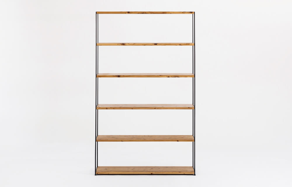 杉は調湿効果や香りを有し、書類や書籍をやさしく収納します。25mm厚の国産杉幅はぎ板と薄いフレームのシェルフラックです。左右どちらでも連結可能で空間に合わせて拡張できます。棚板幅は600mm、900mm、1,200mmの3種類から、フレームは3段、4段、5段から選べます。1段あたりの有効内寸は板幅×高さ365mm×奥行350mmです。